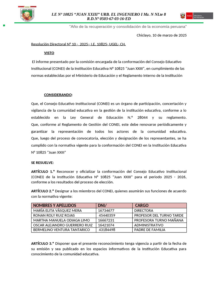 Resolución Directoral N° 10 - 2025– I.E. 10825- UGEL- CH.