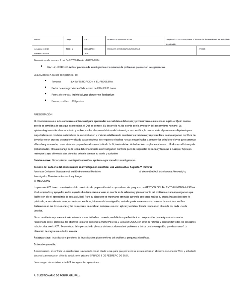 Apellido: Código: ATA 2 LA INVESTIGACION Y EL PROBLEMA Competencia: 210601011-Procesar la información de acuerdo con las necesidades