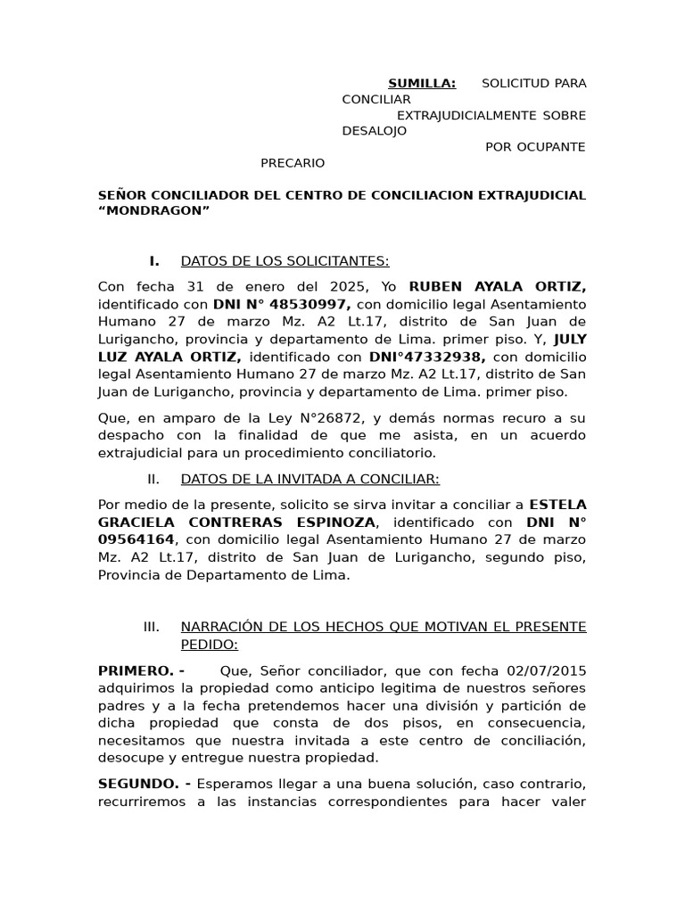 Por medio de la presente, solicito se sirva invitar a conciliar a ESTELA