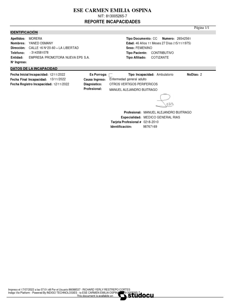 Fecha Registro Incapacidad: 12/11/2022 Diagnóstico: OTROS VERTIGOS PERIFERICOS
