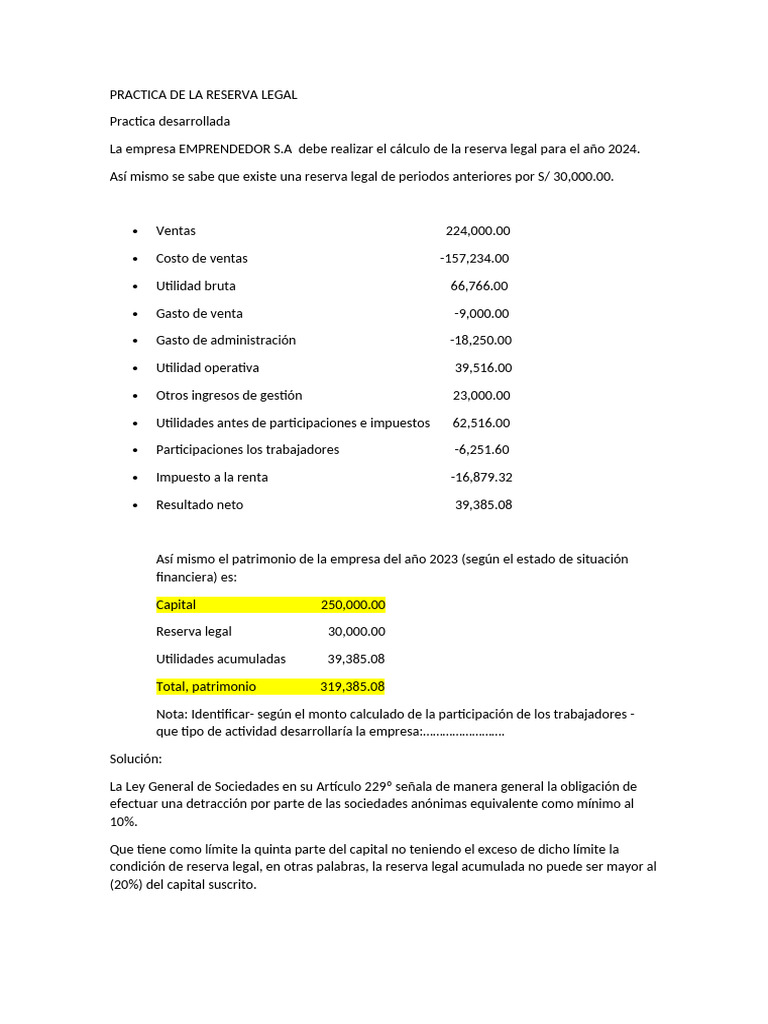 La empresa EMPRENDEDOR S.A debe realizar el cálculo de la reserva legal para el año 2024.