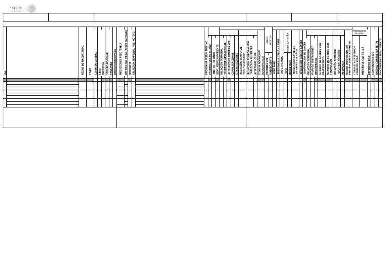 RT (RELACIÓN TEMPORAL POR MOTIVO): 1.PRIMERA VEZ, 2.SUBSECUENTE 5.PROGRAMA: 1.ENFERMEDADES TRANSMISIBLES, 2.CRÓNICO DEGENERATIVAS, 3.OTRAS ENFERMEDADES, 4.A SANOS 12. PESO PARA LA TALLA: 1.OBESIDAD, 2.SOBREPESO, 3.NORMAL,4.DESNUTRICIÓN LEVE, 5.DESNUTRICIÓN MODERADA, 6.DESNUTRICIÓN GRAVE