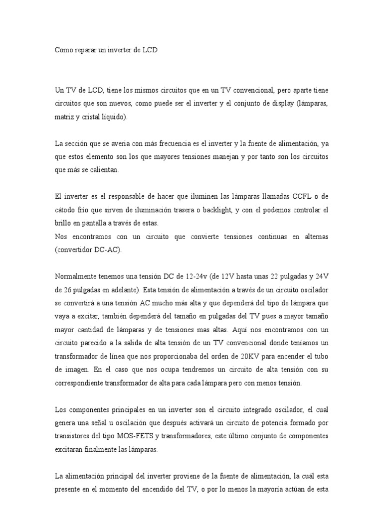 Un TV de LCD, tiene los mismos circuitos que en un TV convencional, pero aparte tiene circuitos que son nuevos, como puede ser el inverter y el conjunto de display (lmparas, matriz y cristal lquido). La seccin que se averia con ms frecuencia es el inverter y la fuente de alimentacin, ya que estos elemento son los que mayores tensiones manejan y por tanto son los circuitos que ms se calientan. El inverter es el responsable de hacer que iluminen las lmparas llamadas CCFL o de ctodo fro que sirven de iluminacin trasera o backlight, y con el podemos controlar el brillo en pantalla a travs de estas. Nos encontramos con un circuito que convierte tensiones continuas en alternas (convertidor DC-AC). Normalmente tenemos una tensin DC de 12-24v (de 12V hasta unas 22 pulgadas y 24V de 26 pulgadas en adelante). Esta tensin de alimentacin a travs de un circuito oscilador se convertir a una tensin AC mucho ms alta y que depender del tipo de lmpara que vaya a excitar, tambin depender del tamao en pulgadas del TV pues a mayor tamao mayor cantidad de lmparas y de tensiones mas altas. Aqu nos encontramos con un circuito parecido a la salida de alta tensin de un TV convencional donde tenamos un transformador de lnea que nos proporcionaba del orden de 20KV para encender el tubo de imagen. En el caso que nos ocupa tendremos un circuito de alta tensin con su correspondiente transformador de alta para cada lmpara pero con menos tensin. Los componentes principales en un inverter son el circuito integrado oscilador, el cual genera una seal u oscilacin que despus activar un circuito de potencia formado por transistores del tipo MOS-FETS y transformadores, este ltimo conjunto de componentes excitaran finalmente las lmparas. La alimentacin principal del inverter proviene de la fuente de alimentacin, la cul esta presente en el momento del encendido del TV, o por lo menos la mayora actan de esta