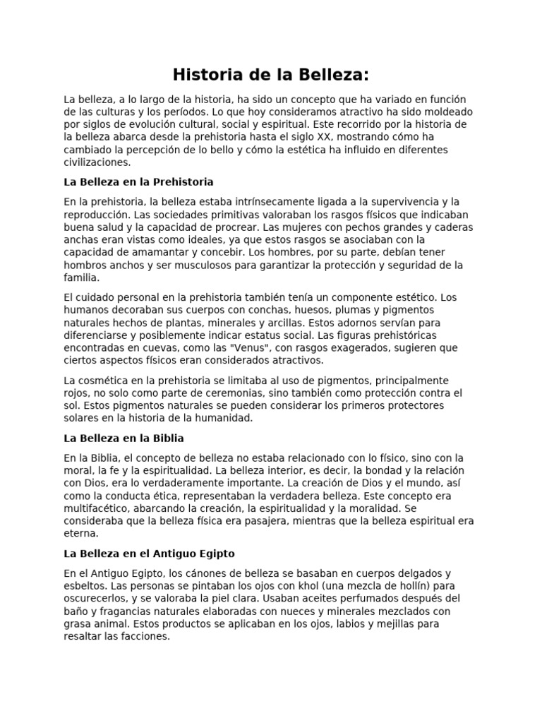 la belleza abarca desde la prehistoria hasta el siglo XX, mostrando cómo ha