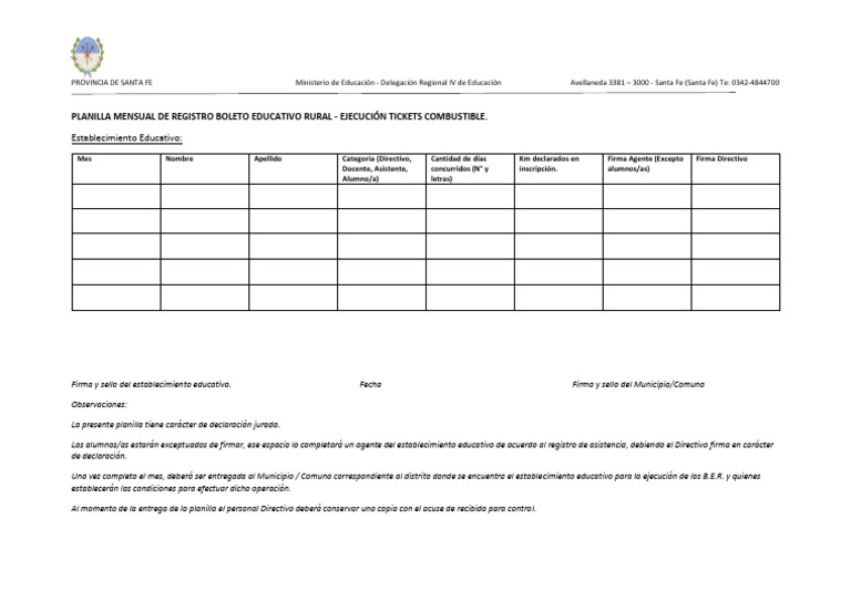 PLANILLA MENSUAL DE REGISTRO BOLETO EDUCATIVO RURAL - EJECUCIÓN TICKETS COMBUSTIBLE.