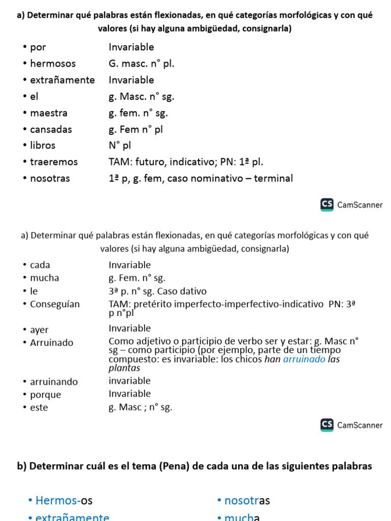 a) Determinar qué palabras están flexionadas, en qué categorías morfológicas y con qué
