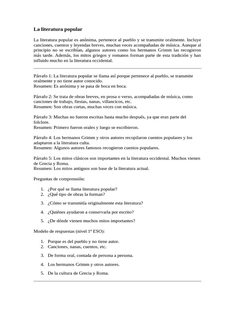 Párrafo 1: La literatura popular se llama así porque pertenece al pueblo, se transmite