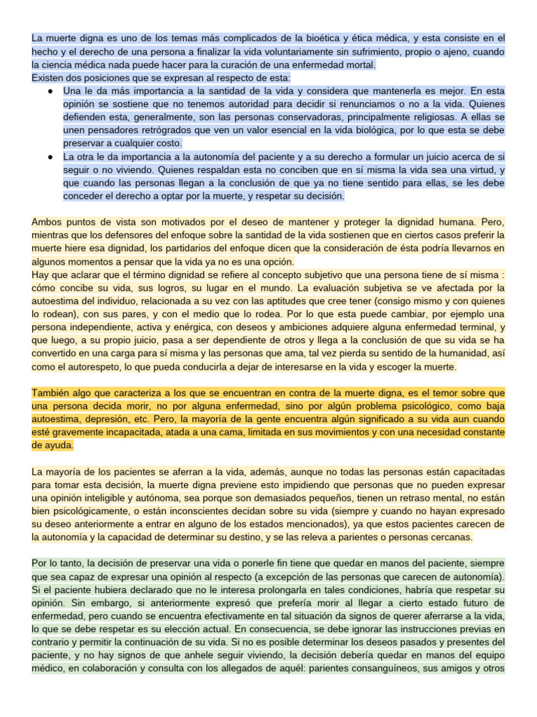 La muerte digna es uno de los temas más complicados de la bioética y ética médica, y esta consiste en el