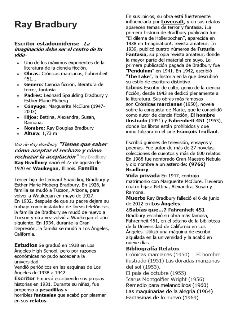 Padres: Leonard Spaulding Bradbury y ficción, desde 1943 se dedicó plenamente a