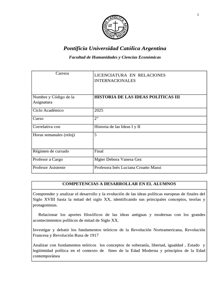 Nombre y Código de la HISTORIA DE LAS IDEAS POLÍTICAS III
