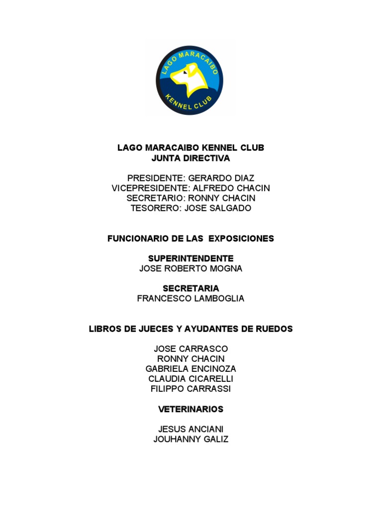 LAGO MARACAIBO KENNEL CLUB JUNTA DIRECTIVA PRESIDENTE: GERARDO DIAZ VICEPRESIDENTE: ALFREDO CHACIN SECRETARIO: RONNY CHACIN