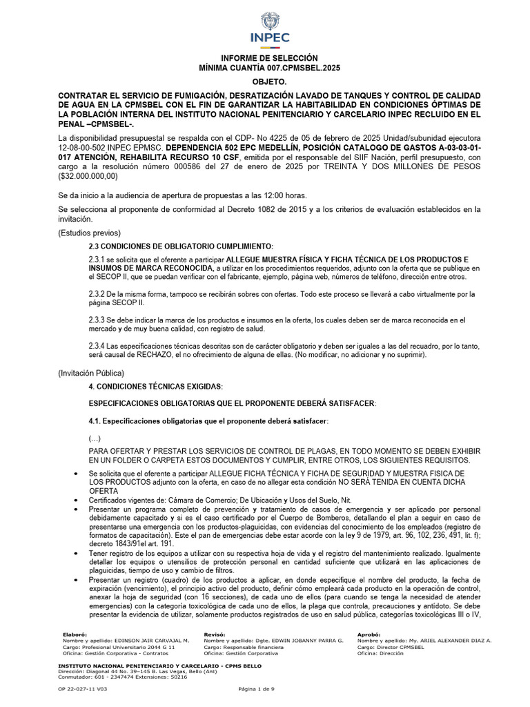 de la Invitación Pública No. MÍNIMA CUANTÍA 007.CPMSBEL.2025