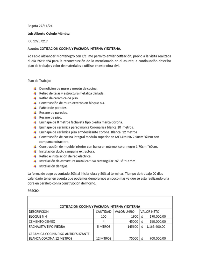 Yo Fabio alexander Montenegro con c/c me permito enviar cotización, previo a la visita realizada