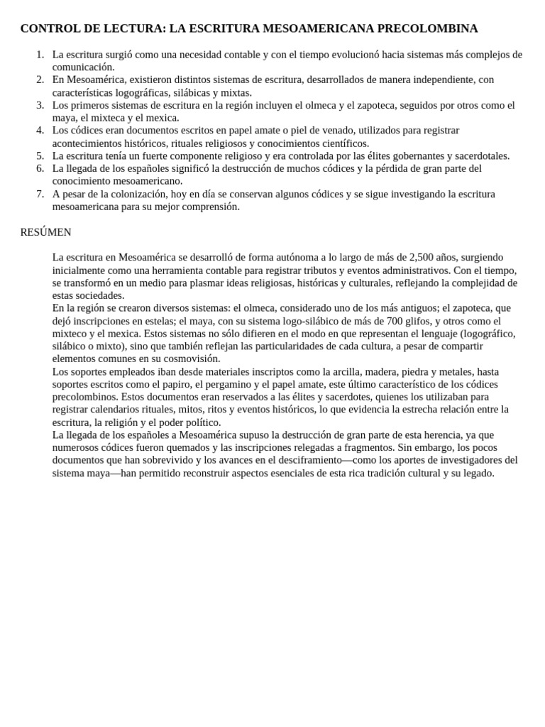 CONTROL DE LECTURA: LA ESCRITURA MESOAMERICANA PRECOLOMBINA