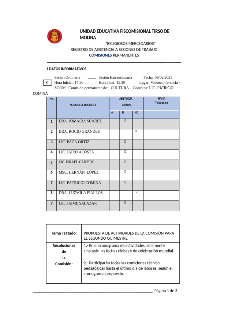 Tema Tratado: PROPUESTA DE ACTIVIDADES DE LA COMISIÓN PARA