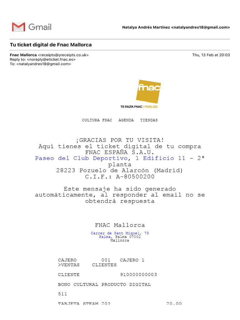 Fnac Mallorca <receipts@yreceipts.co.uk> Thu, 13 Feb at 20:03