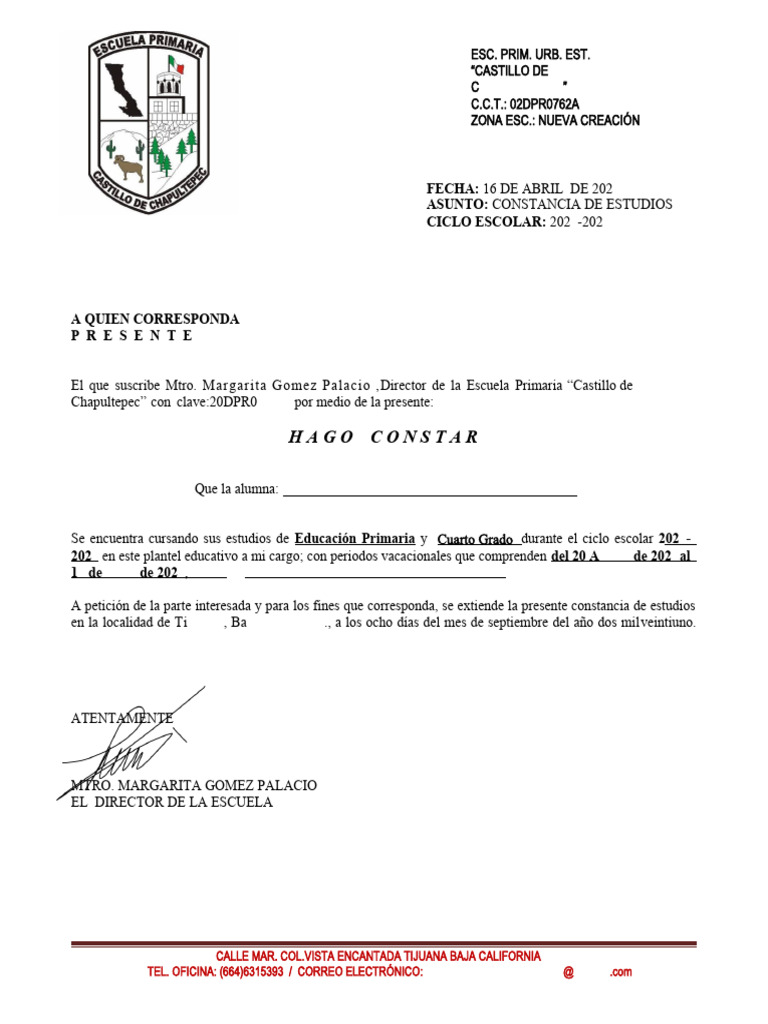 El que suscribe Mtro. Margarita Gomez Palacio ,Director de la Escuela Primaria “Castillo de