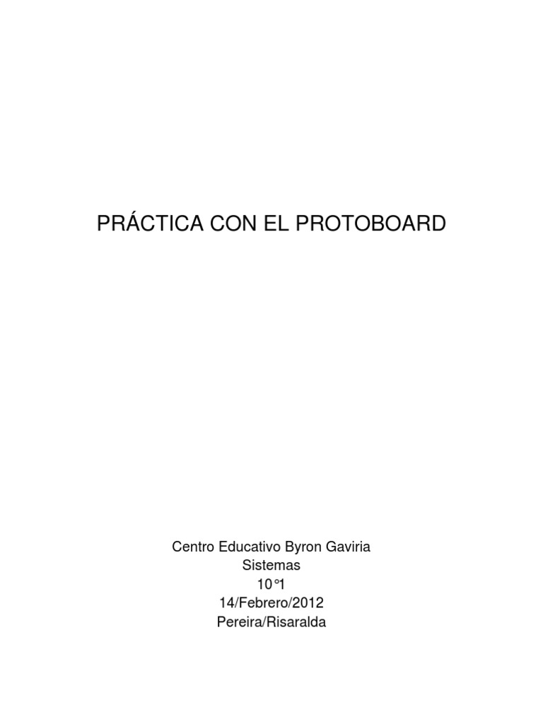El siguiente trabajo muestra una pequea prctica con el protoboard, contiene una corta explicacin de lo significan los componentes de circuitos realizados en clase con sus respectivas imgenes, tambin contiene la debida explicacin de dichos circuitos.