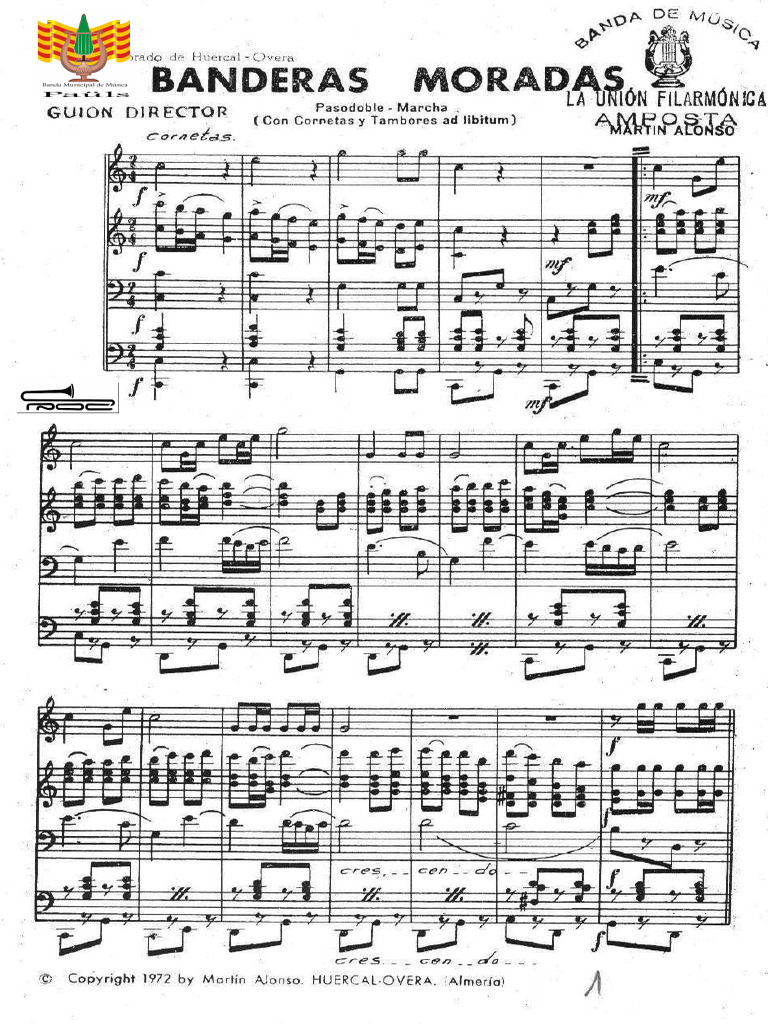 El documento presenta una serie de composiciones musicales tituladas 'BANDERAS MORADAS', todas compuestas por Martin Alonso. Estas piezas son pasodobles y marchas que incluyen la participación de cornetas y tambores ad libitum. Se mencionan diferentes instrumentos como flautas, clarinetes, saxofones y trompetas en el contexto de estas composiciones.