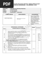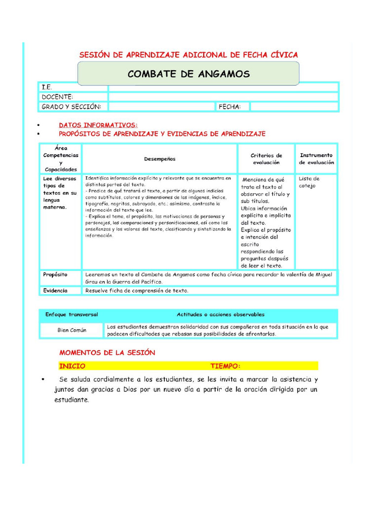 La ficha de aprendizaje se centra en la sesión titulada 'El combate de Angamos'. Está destinada a un grado específico y se utiliza en el área de comunicación. Se incluye información sobre el profesor y la fecha de la actividad.