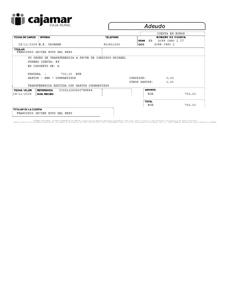 Registro Estatal de Sociedades Cooperativas, con número de inscripción 2627-SMT. NIF-F04743175. BIC: CCRIES2AXXX. Domicilio Social Plaza Puerta de Purchena, núm. 10 - 04001 ALMERÍA. Entidad del Grupo Cooperativo CAJAMAR.