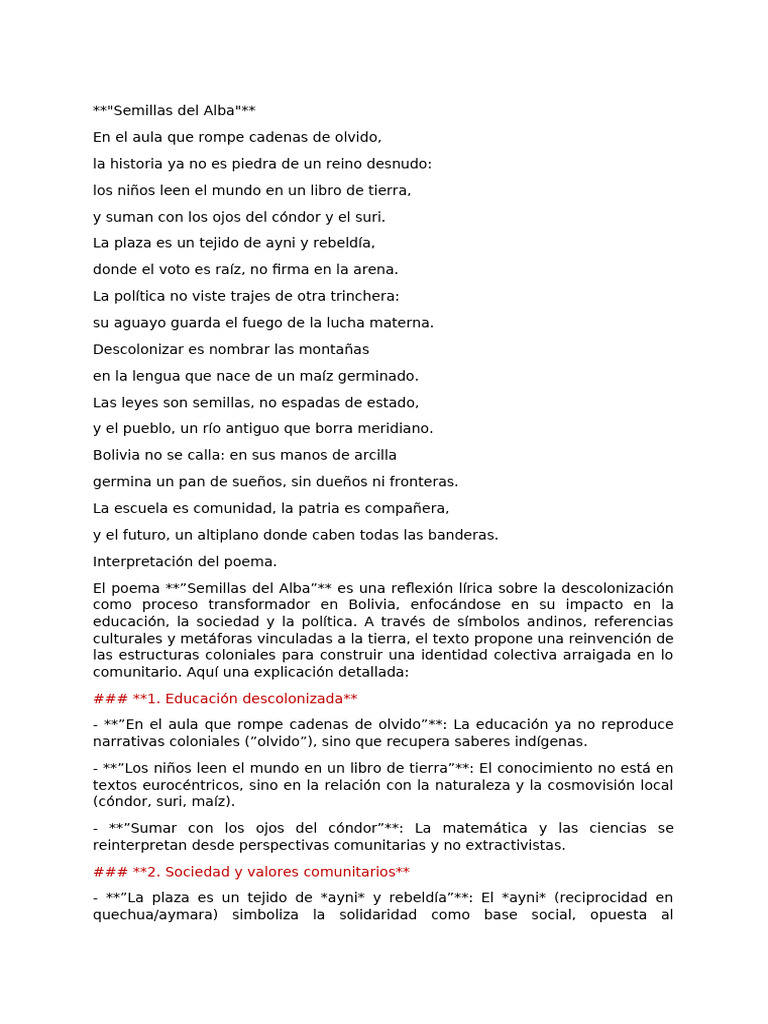El poema **”Semillas del Alba”** es una reflexión lírica sobre la descolonización