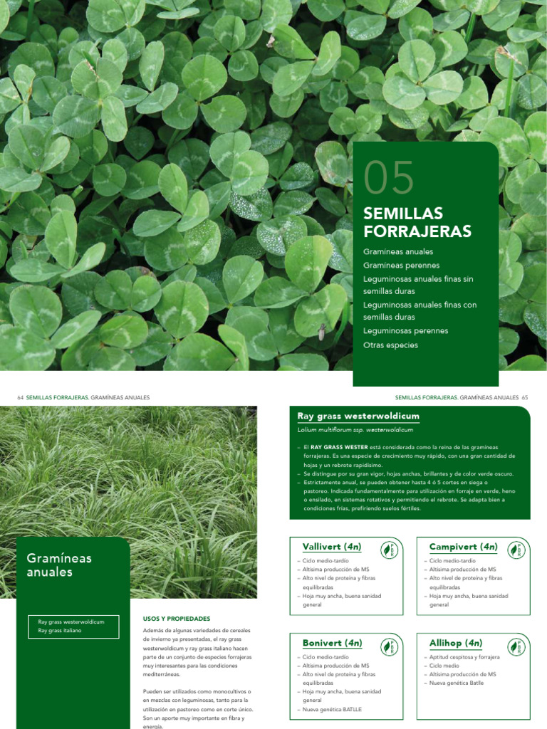 y 4 años. Su valor nutritivo es superior al del ray grass italiano. Está indicado variedades de leguminosas perennes o de auto-resiembra.