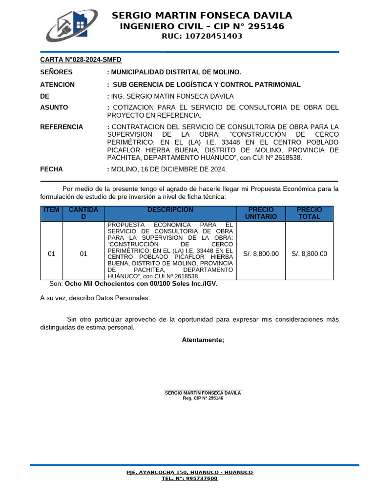 ASUNTO : COTIZACION PARA EL SERVICIO DE CONSULTORIA DE OBRA DEL