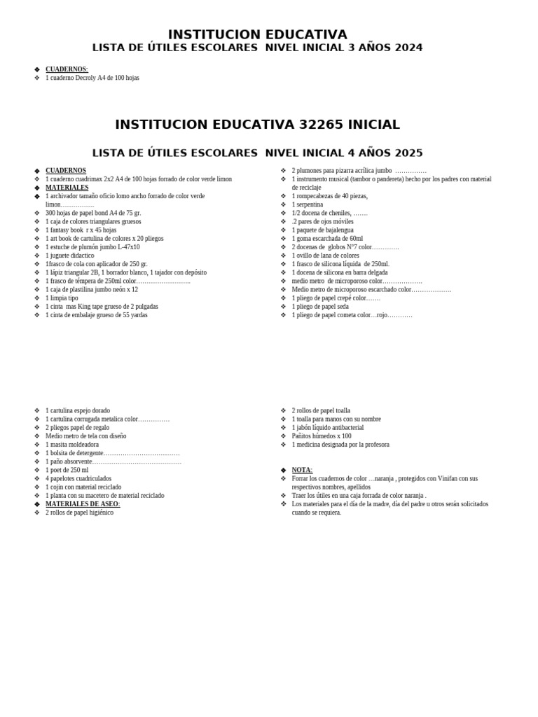 LISTA DE ÚTILES ESCOLARES NIVEL INICIAL 4 AÑOS 2025