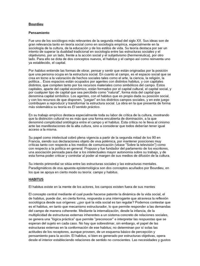 pensamiento para la acción. El habitus, si bien es generado por estructuras objetivas, opera