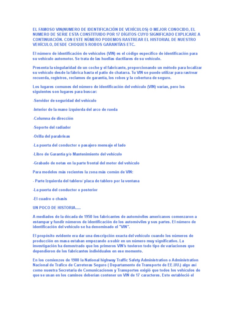 A CONTINUACIN. CON ESTE NMERO PODEMOS RASTREAR EL HISTORIAL DE NUESTRO VEHCULO, DESDE CHOQUES ROBOS GARANTAS ETC. El nmero de identificacin de vehculos (VIN) es el cdigo especfico de identificacin para su vehculo automotor. Se trata de las huellas dactilares de su vehculo. Presenta la singularidad de un coche y el fabricante, proporcionando un mtodo para localizar su vehculo desde la fbrica hasta el patio de chatarra. Tu VIN se puede utilizar para rastrear recuerda, registros, reclamos de garanta, los robos y la cobertura de seguro. Los lugares comunes del nmero de identificacin del vehculo (VIN) varan, pero los siguientes son lugares para buscar: -Servidor de seguridad del vehculo -Interior de la mano izquierda del arco de rueda -Columna de direccin -Soporte del radiador -Orilla del parabrisas -La puerta del conductor o pasajero mensaje el lado -Libro de Garanta y/o Mantenimiento del vehculo -Grabado de notas en la parte frontal del motor del vehculo Para modelos ms recientes la zona ms comn de VIN: - Parte Izquierda del tablero/ placa de tablero por la ventana -La puerta del conductor o posterior -El cuadro o chasis UN POCO DE HISTORIA..... A mediados de la dcada de 1950 los fabricantes de automviles americanos comenzaron a estampar y fundir nmeros de identificacin de los automviles y sus partes. El nmero de identificacin del vehculo se ha denominado el "VIN". El propsito evidente era dar una descripcin exacta del vehculo cuando los nmeros de produccin en masa estaban empezando a subir en un nmero muy significativo. La investigacin ha demostrado que los primeros VIN's tuvieron todo tipo de variaciones que dependieron de los fabricantes individuales en ese momento. En los comienzos de 1980 la National highway Traffic Safety Administration o Administration Nacional de Trafico de Carreteras Seguro ( Departamento de Transporte de [Link].) algo as como nuestra Secretaria de Comunicaciones y Transportes exigi que todos los vehculos de que se usan en los caminos deberan contener un VIN de 17 caracteres. Esto estableci el