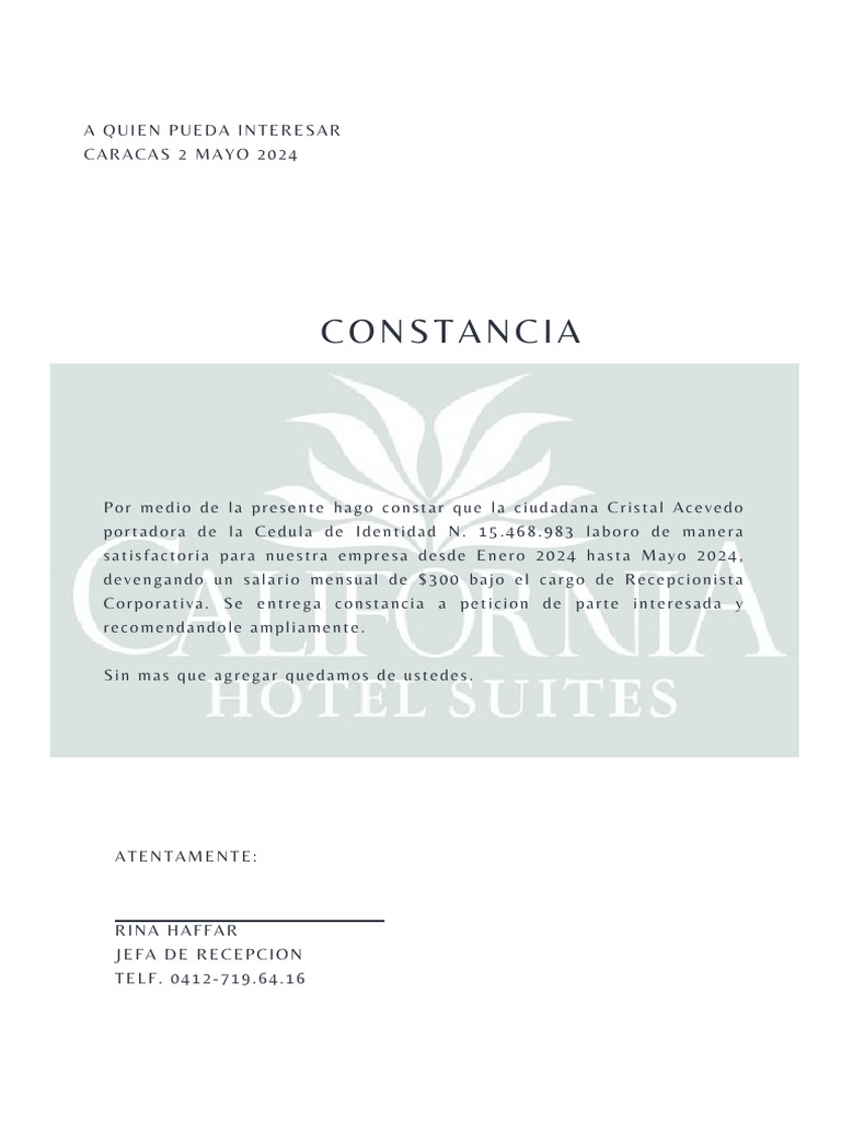 Por medio de la presente hago constar que la ciudadana Cristal Acevedo