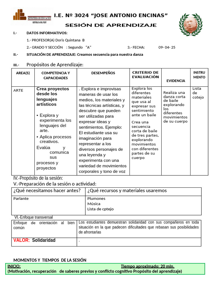 2.- GRADO Y SECCIÓN : Segundo “A” 3.- FECHA: 09- 04- 25