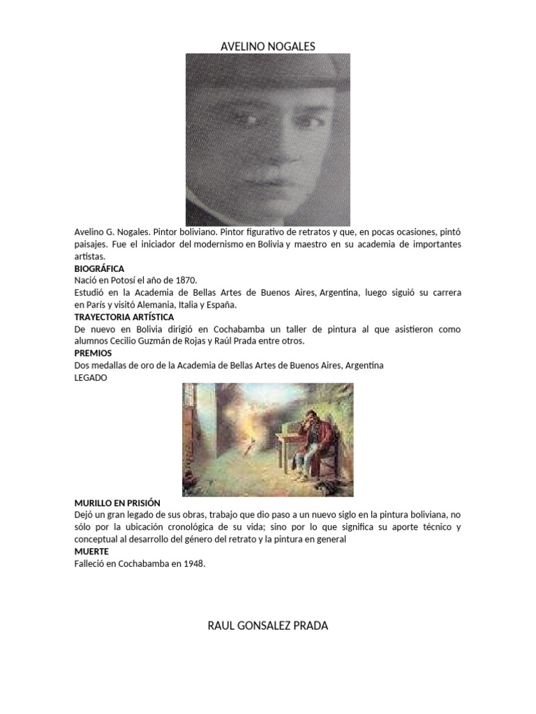 Avelino G. Nogales. Pintor boliviano. Pintor figurativo de retratos y que, en pocas ocasiones, pintó