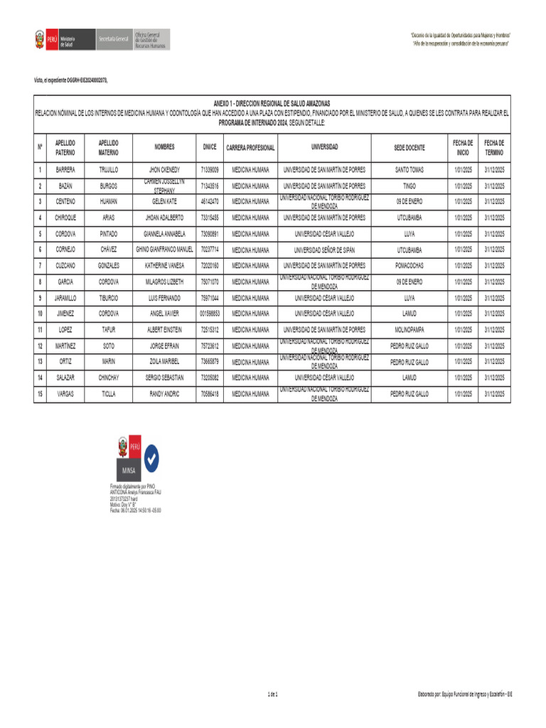 11 LOPEZ TAFUR ALBERT EINSTEIN 72515312 MEDICINA HUMANA UNIVERSIDAD DE SAN MARTÍN DE PORRES MOLINOPAMPA 1/01/2025 31/12/2025
