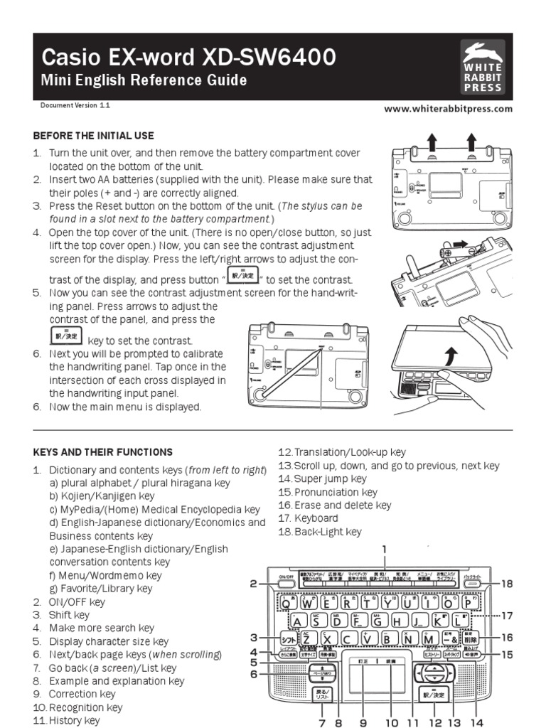 ” 3. Some dictionaries cannot be jumped to. Pick a dictionary and press key “12” to jump to that dictionary. condensing all the information needed to master kana and kanji into a compact flashcard format to make study and drills as efficient as possible. and then press key “12” to look up the word. Press key “14” to display the selection cursor. and higher quality construction. Now you can see the list of dictionaries you can jump. 2. 4. Some dictionaries cannot be jumped to. If you would like to go back to the screen where you originally jumped from. Press key “14” to display the selection cursor. Press key “14” to display the selection cursor.whiterabbitpress. Pick a dictionary and press key “12” to jump to that dictionary. then press key “12. 1. White Rabbit PRess www. you can jump to that word’s definition as follows: 1. visit us on the web where you can download sample card images. 4. 1. Use key group “13” to select a word. If an arrow is displayed before a word in the definition on the screen. depending on your selection. depending on your selection. 2. Use key group “13” to select the word which has the arrow.” 3. Then press key “12. Now you can see the list of candidate words based on your selection. 1. What makes our cards the most desired Japanese study cards worldwide? We trump the competition by offering better content. Use key group “13” to select the English word you would like to look up. 2. and see for yourself what makes our cards soar above the competition. Don’t just take our word for it. Now you can see the list of dictionaries you can jump. more sensible design.using the super-juMp function (This function is useful to find the kana (yomi) for a given kanji word) You can jump from any single kana. 1. kanji or English word. Press key “7” or “14” once to remove the selection cursor. If you would like to exit super-jump mode. and press key “12” to look up the word. If you would like to jump from kana or kanji words. and then press key “12” to look up the word.com . Use key group “13” and move the cursor to highlight the first letter of the word you’d like to look up. Now you can see a list of candidate words based on your selection. Use key group “13” to select a word. If you would like to jump from an English word. W hite Rabbit Press’ products have helped thousands of Japanese language learners in over 25 countries master the Japanese language. Press key “7” (several times) until you can see the original screen.