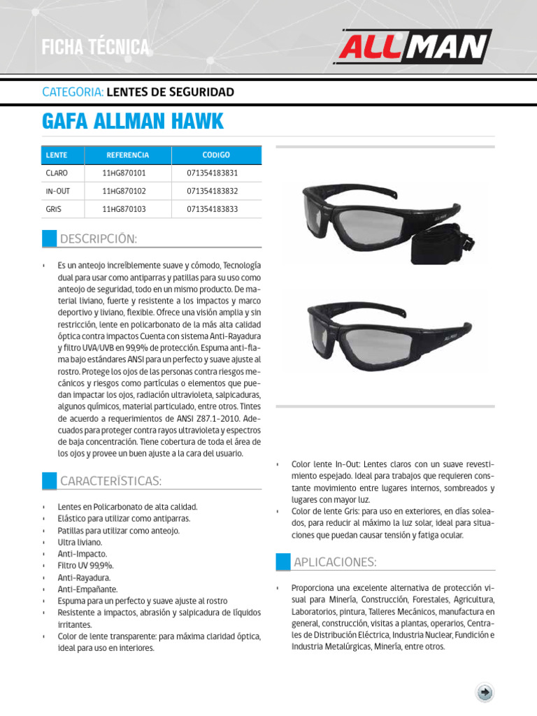 • Color de lente transparente: para máxima claridad óptica, les de Distribución Eléctrica, Industria Nuclear, Fundición e