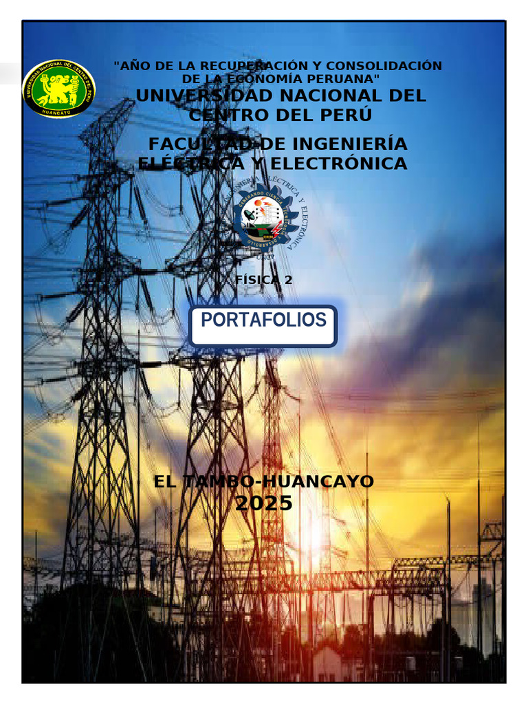 El documento se presenta como un portafolio de la Facultad de Ingeniería Eléctrica y Electrónica de la Universidad Nacional del Centro del Perú. Está relacionado con el tema del 'Año de la Recuperación y Consolidación de la Economía Peruana'. Se menciona que el portafolio corresponde al año 2025 y se ubica en El Tambo-Huancayo.
