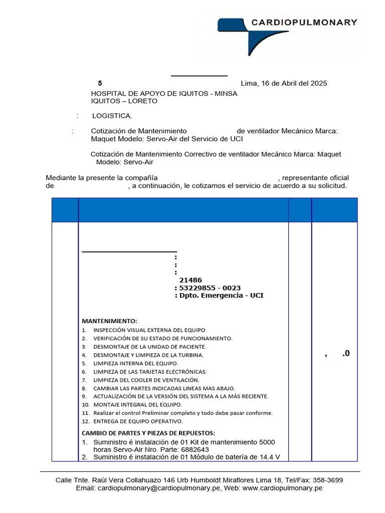 Referencia: Cotización de Mantenimiento Correctivo de ventilador Mecánico Marca: Maquet
