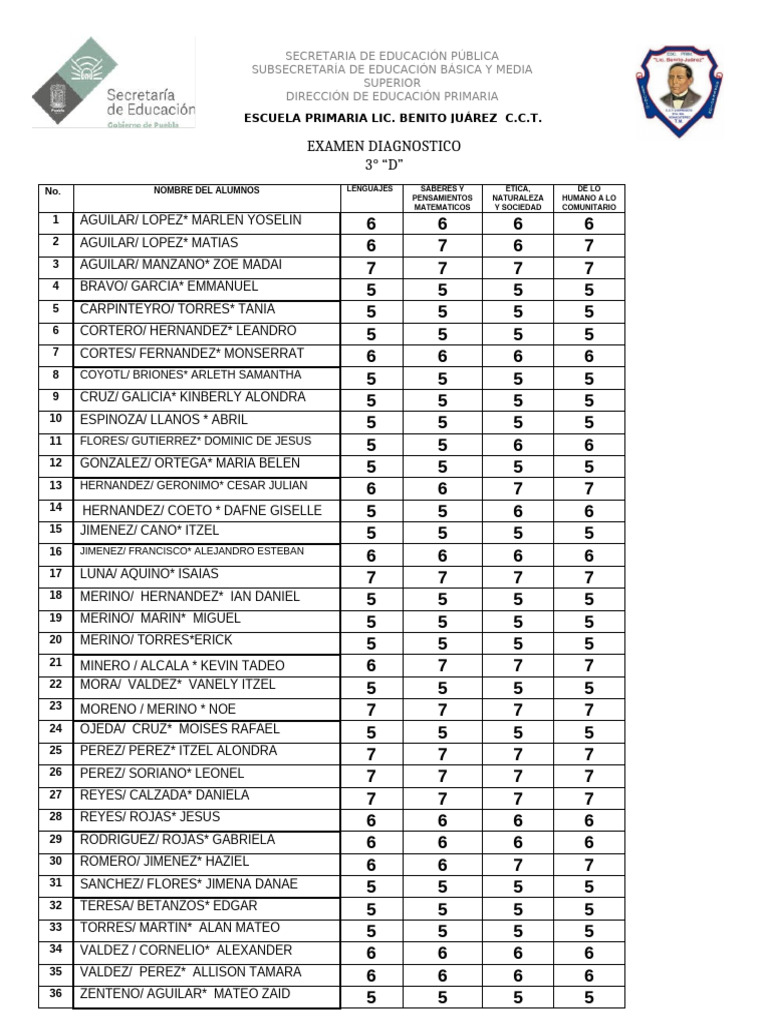 En la escuela Lic. Benito Juárez, se realizó la evaluación diagnostica a 36 alumnos de tercer grado
