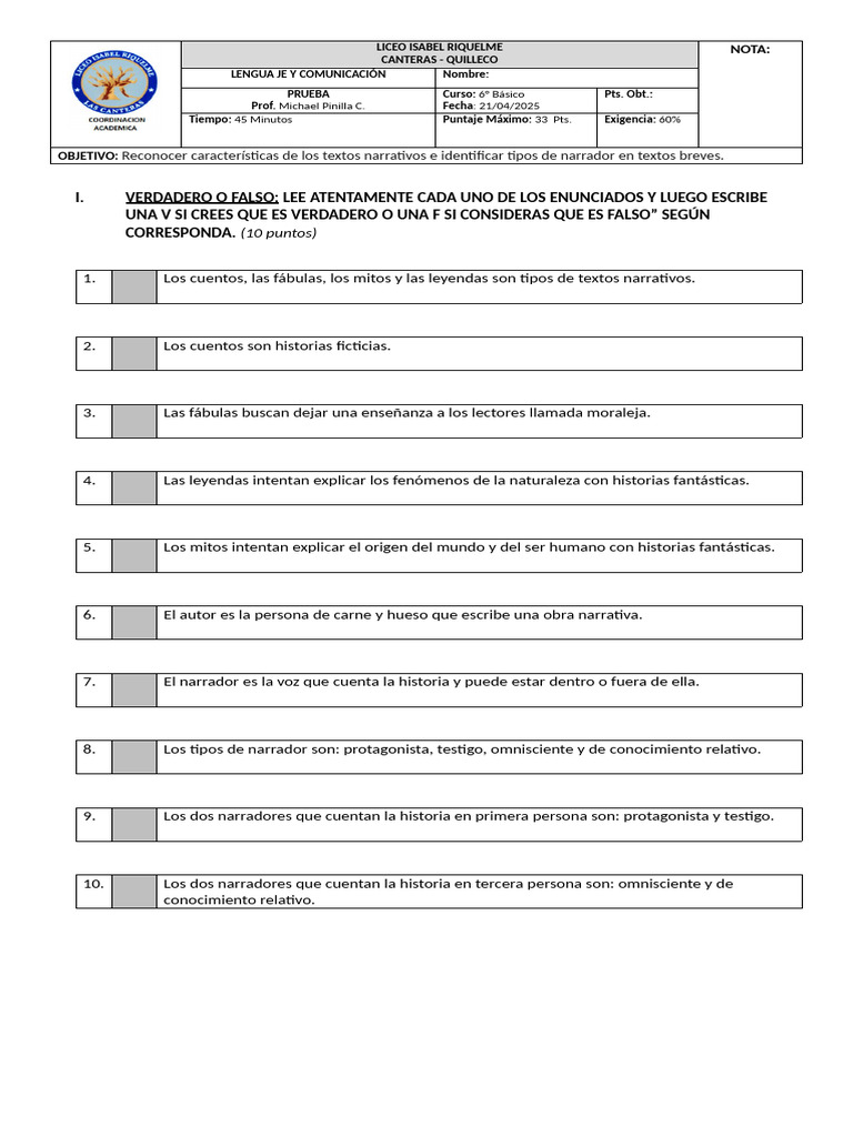 Tiempo: 45 Minutos Puntaje Máximo: 33 Pts. Exigencia: 60%