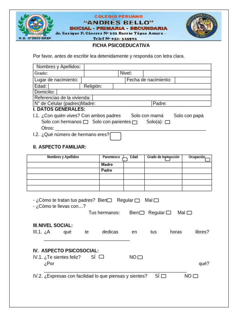 Nombres y Apellidos Parentesco Edad Grado de Instrucción Ocupación