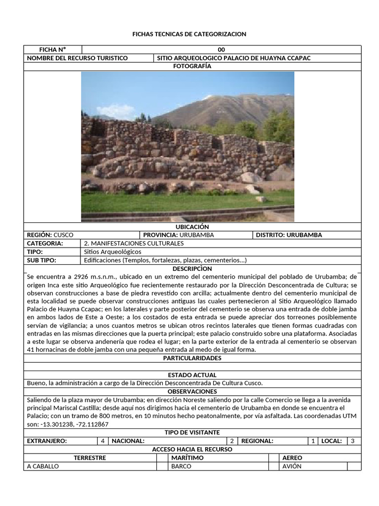 NOMBRE DEL RECURSO TURISTICO SITIO ARQUEOLOGICO PALACIO DE HUAYNA CCAPAC