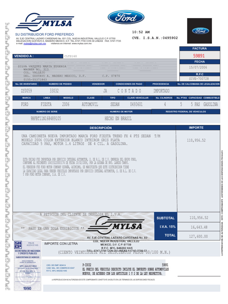 R.F.C. MYL 840202 HA5 EL PRECIO DEL VEHICULO DESCRITO INCLUYE EL IMPUESTO SOBRE AUTOMOVILES
