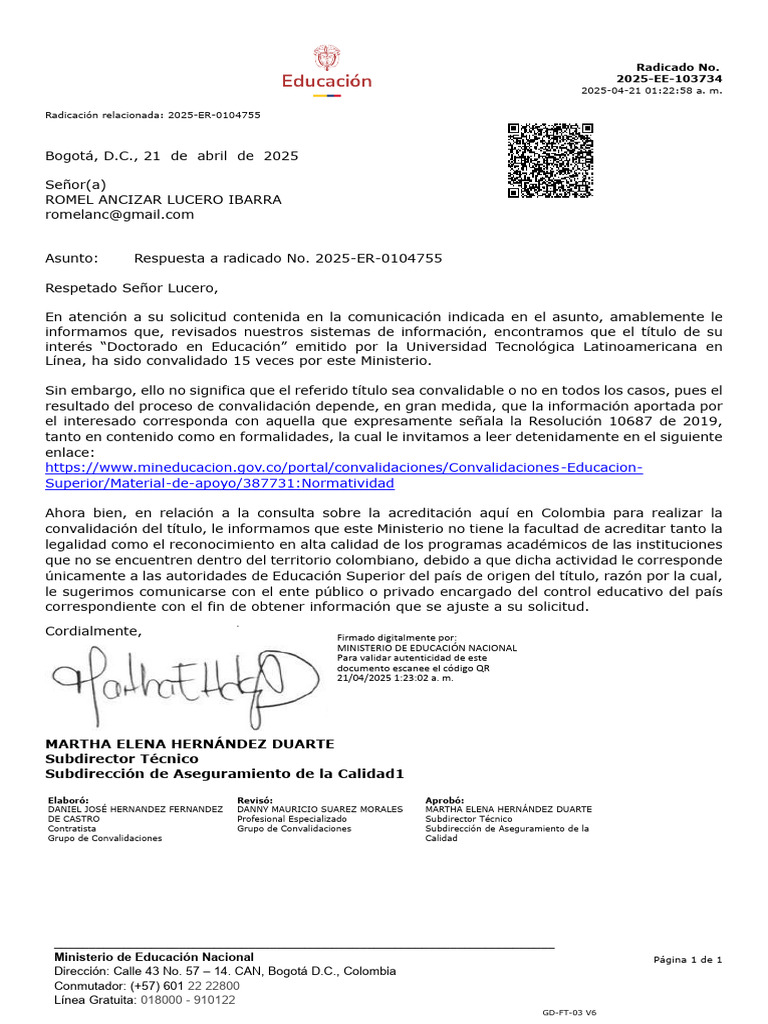 interés “Doctorado en Educación” emitido por la Universidad Tecnológica Latinoamericana en