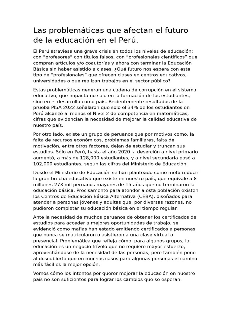 prueba PISA 2022 señalaron que solo el 34% de los estudiantes en