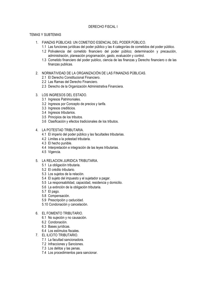 1 Las funciones jurdicas del poder pblico y las 4 categoras de cometidos del poder pblico. 1.2 Polivalencia del cometido financiero del poder pblico; determinacin y precaucin, administracin, planeacin programacin, gasto, evaluacin y control. 1.3 Cometido financiero del poder publico, ciencia de las finanzas y Derecho financiero o de las finanzas publicas. 2. NORMATIVIDAD DE LA ORGANIZACIN DE LAS FINANZAS PBLICAS. 2.1 El Derecho Constitucional Financiero. 2.2 Las Ramas del Derecho Financiero. 2.3 Derecho de la Organizacin Administrativa Financiera. 3. LOS INGRESOS DEL ESTADO. 3.1 Ingresos Patrimoniales. 3.2 Ingresos por Concepto de precios y tarifa. 3.3 Ingresos crediticios. 3.4 Ingresos tributarios. 3.5 Principios de los tributos. 3.6 Clasificacin y efectos tradicionales de los tributos. 4. LA POTESTAD TRIBUTARIA. 4.1 El imperio del poder pblico y las facultades tributarias. 4.2 Limites a la potestad tributaria. 4.3 El hecho punible. 4.4 Interpretacin e integracin de las leyes tributarias. 4.5 Vigencia. 5. LA RELACION JURIDICA TRIBUTARIA. 5.1 La obligacin tributaria. 5.2 El crdito tributario. 5.3 Los sujetos de la relacin. 5.4 El sujeto del impuesto y el sujetador a pagar. 5.5 La responsabilidad, capacidad, residencia y domicilio. 5.6 La extincin de la obligacin tributaria. 5.7 El pago. 5.8 Compensacin. 5.9 Prescripcin y caducidad. 5.10 Condonacin y cancelacin. 6. EL FOMENTO TRIBUTARIO. 6.1 No sujecin y no causacin. 6.2 Condonacin. 6.3 Bases jurdicas. 6.4 Los estmulos fiscales. 7. EL ILICITO TRIBUTARIO. 7.1 La facultad sancionadora. 7.2 Infracciones y Sanciones. 7.3 Los delitos y las penas. 7.4 Los procedimientos para sancionar.