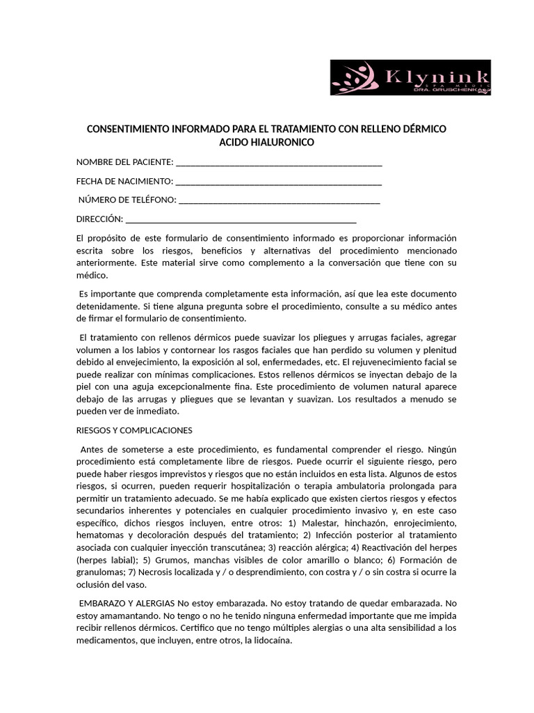 CONSENTIMIENTO INFORMADO PARA EL TRATAMIENTO CON RELLENO DÉRMICO