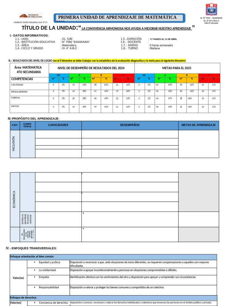 PRIMERA UNIDAD DE APRENDIZAJE DE MATEMÁTICA IE.