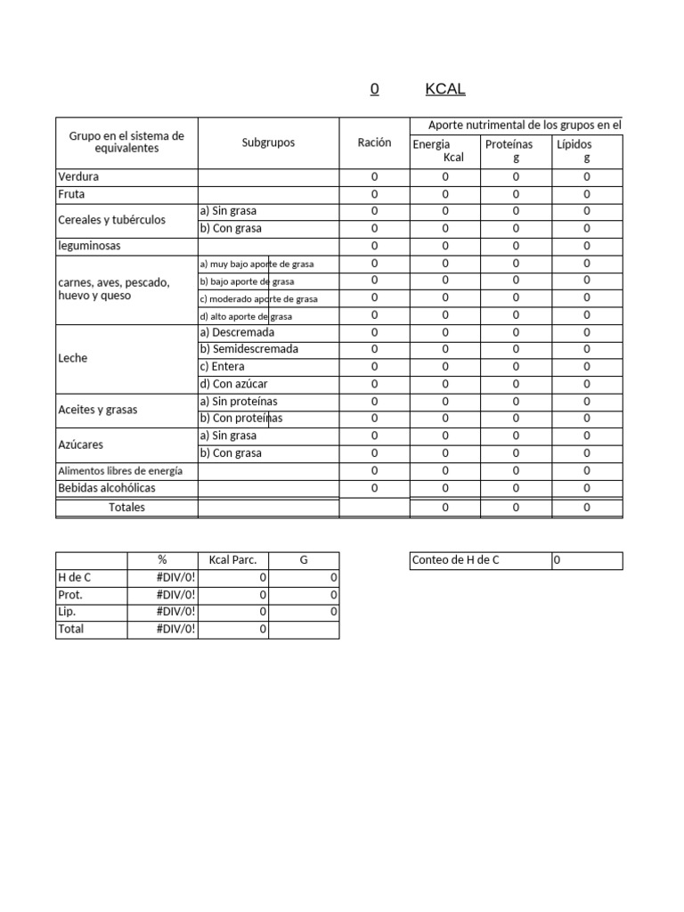 GRUPO SUBGR KCAL PROT LIP H de C % Conteo KCAL TOTALES 1500